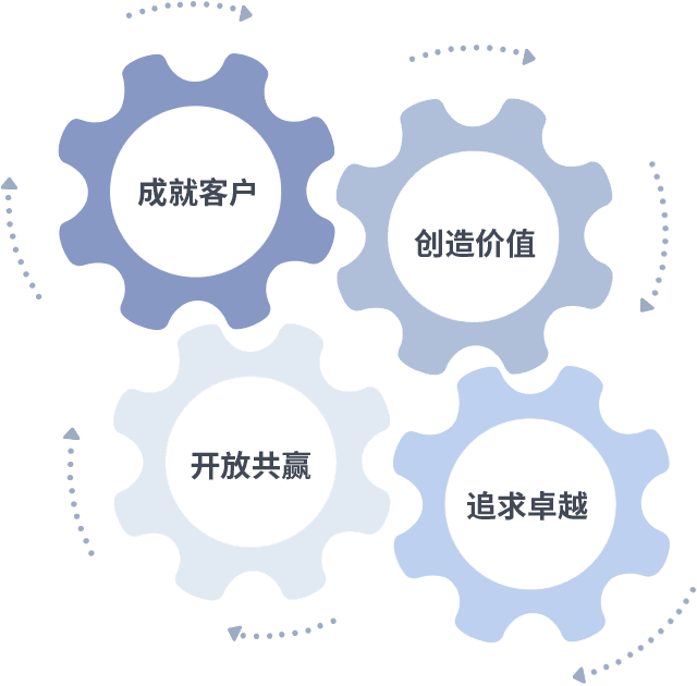 成就客户是一切决策的出发点,,创造价值是衡量所有工作的标准,,追求卓越是我们做事做人的态度,,开放共赢是我们的格局也是最终的结果。。。。价值观的齿轮环环相扣,,,推动着组织里的每个人不断向前。。。。